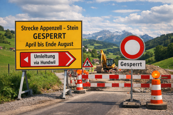 Aufgrund von Bauarbeiten und Strassensanierungen bleibt die Verbindungsstrasse von Appenzell nach Stein AR bis Ende August gesperrt. Die Umfahrung für Autos und Reisecars wird über Hundwil empfohlen. Bitte rechnen Sie mit einer zusätzlichen Reisezeit von ca. 10–15 Minuten.